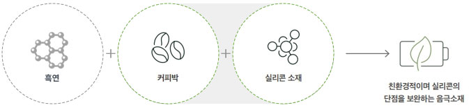 매그나텍 실리콘 음극재는 탄화 커피박과 실리콘을 분산 및 소성 공정을 거쳐 구현되며 기존 흑연 대비 고용량을 갖는 차세대 음극소재입니다.